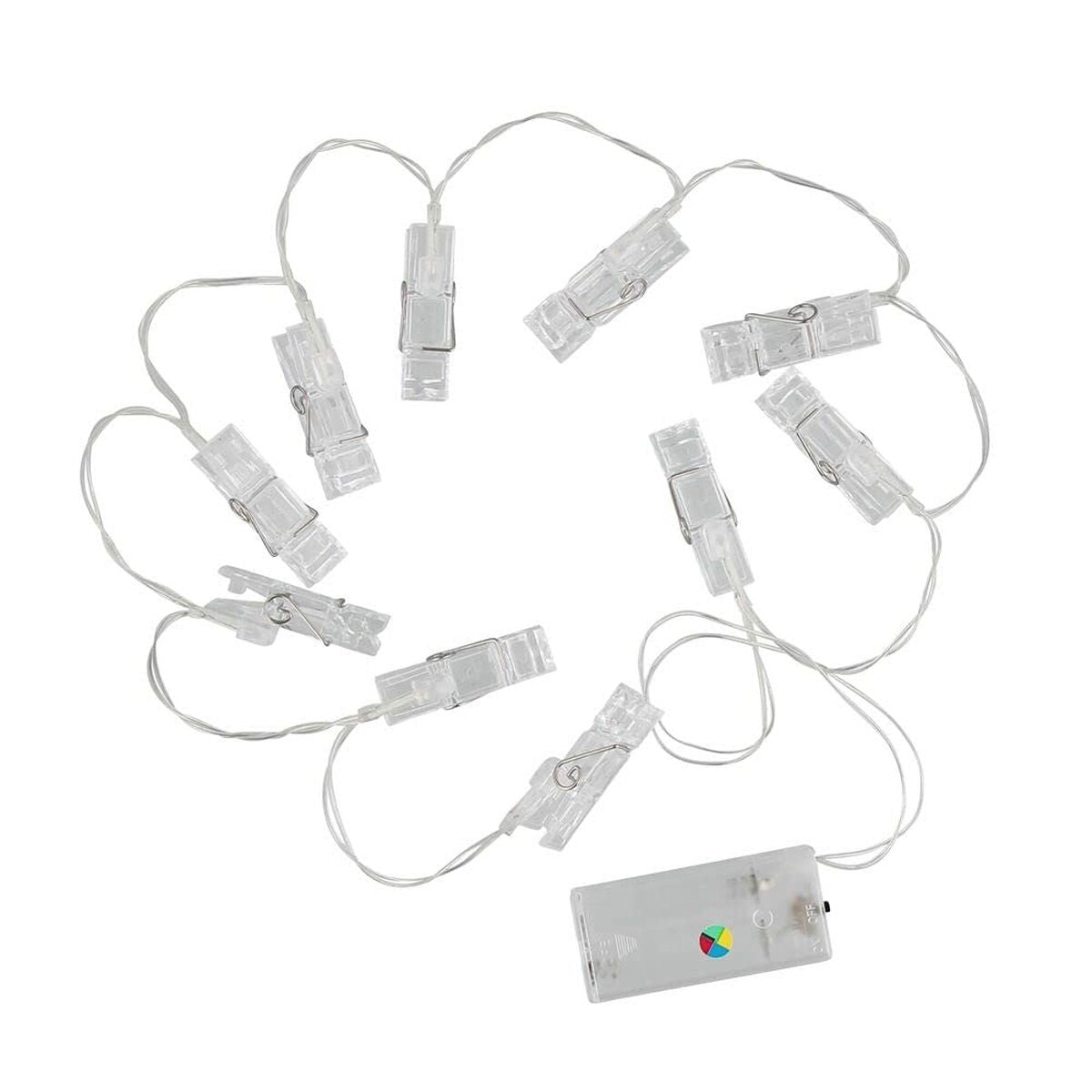 10 klipsua ja toimii AA-paristoilla (ei mukana).