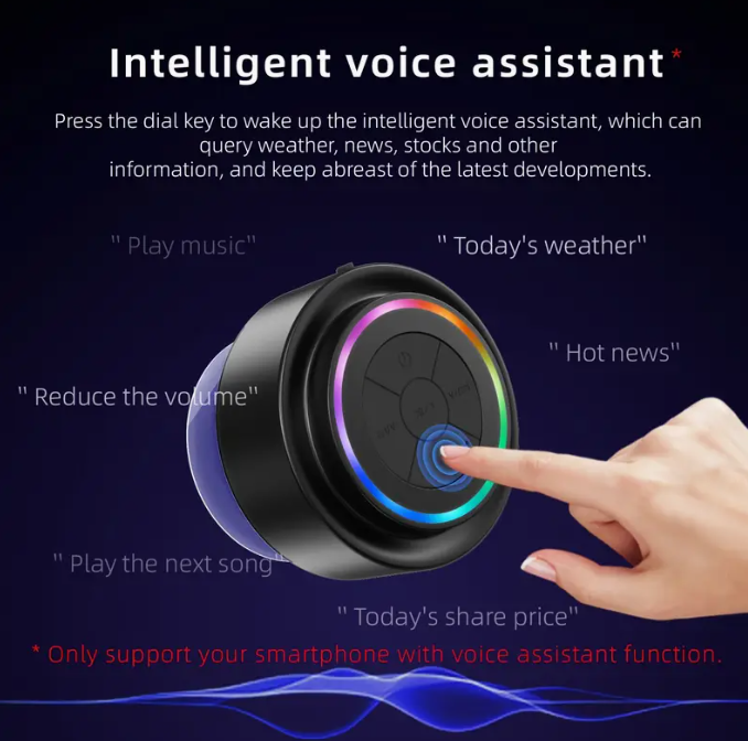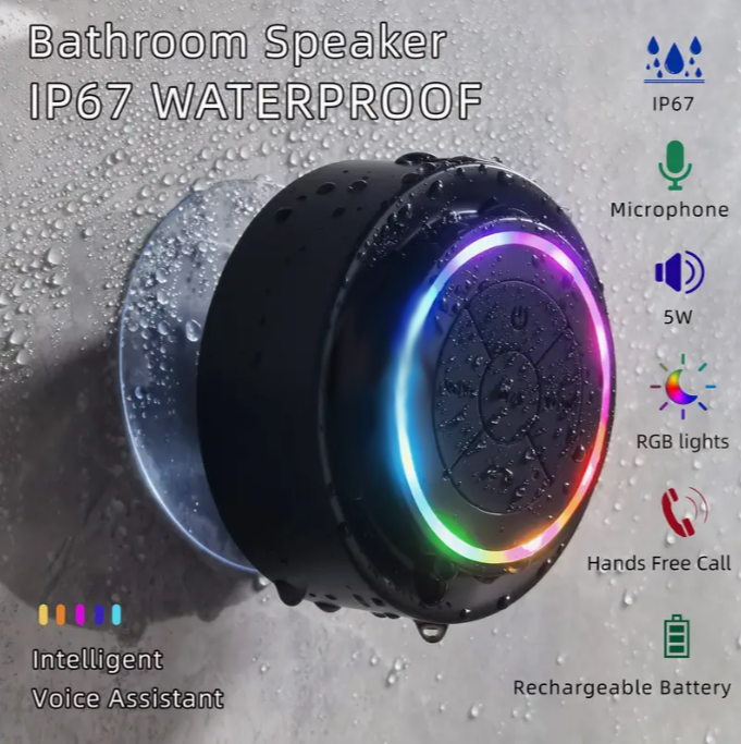 Aäniavusteinen ohjaus, handsfree-puhelut, TWS-synkronointi, 5 W:n tehokas kannettava äänentoisto, ladattava akku, tehokas imukuppikiinnitys, RGB-valotehosteet ja USB-C-lataus. Täydellinen suihkuun, kylpyammeeseen, uima-altaalle tai ulkoseikkailuihin.